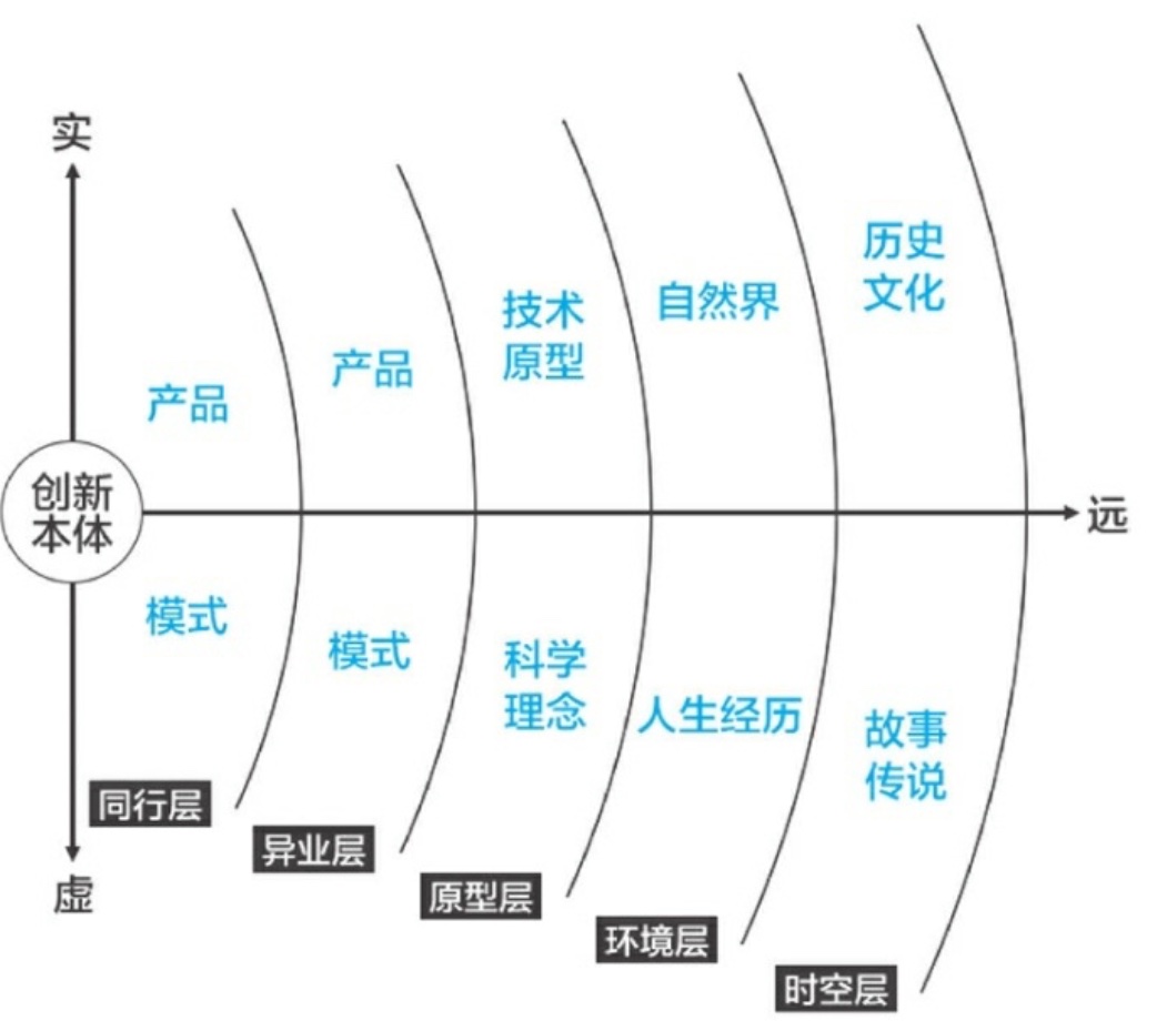 有了激发创造力的环境后,下一步就是要去看创新是如何被产生的。书里通过下图来描述这个过程,图中横轴代表离创新本体的距离,纵轴代表元素属性的虚实,然后以 “创新本体” 为轴心 (以产品创新为例),由近及远地把寻宝图分成 5 个层级 (同行、异业、原型、环境、时空),共 10 个板块,