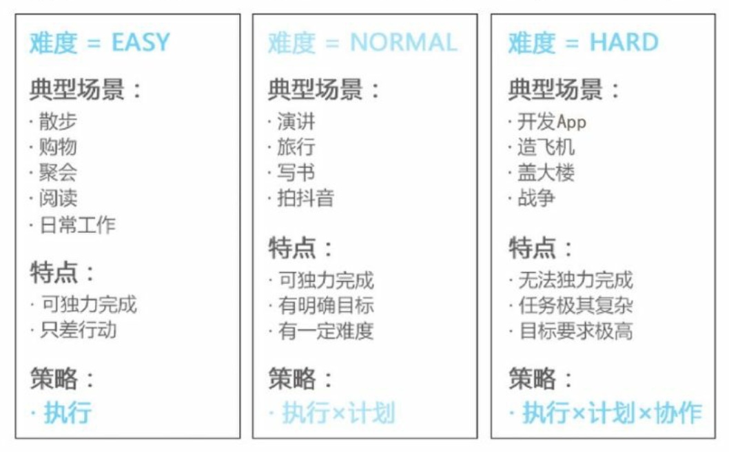 - 把目标分为 easy、normal 和 hard:easy 注重 “执行 (”GTD 方法),normal 注重 “执行 + 计划”,hard 注重 “执行 + 计划 + 协作”