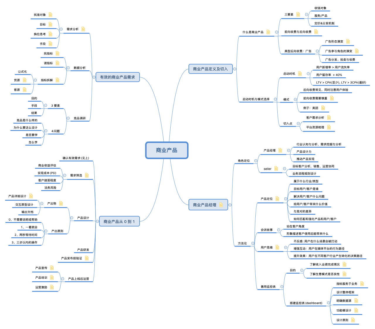 课程里主要讲了四大部分内容 (其实是五章,但是因为对广告进阶这部分比较熟悉,所以略过了这部分):商业产品的定义及演进、商业产品经理的职责与方法论、有效的商业产品需求、商业产品从 0 到 1,下文也是按照这四部分展开,内容经过梳理且只摘录了笔者比较关心的一些内容,推荐看原视频。