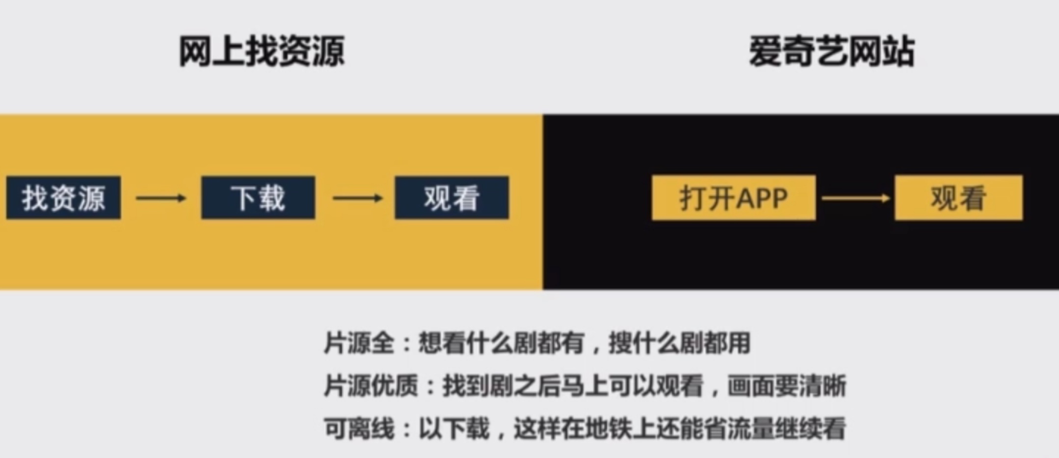 课程里以视频会员为例,介绍了这种模式下的需求挖掘,即用户为了看电影,其传统的行为路径是:先打开搜索引擎 -> 进行资源的搜索和下载 -> 使用电脑播放器打开;而现在常用的一些视频 app 能够更好地满足用户的这些需求,其路径对比如下
