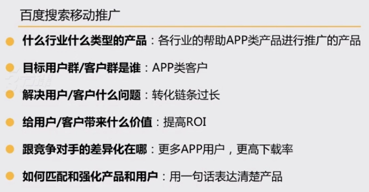 能较好回答出以上的 6 个问题,才算对产品有一个较为清晰的定位,以上面的百度搜索移动推广为例,这 6 个问题的答案如下