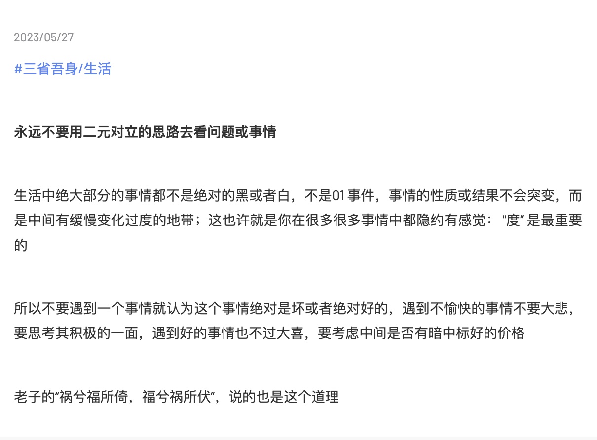 除了聊到的业务,社交平台上的人生智慧或者建议,有很多都是自相矛盾的,从传播学上讲,简短是为了表意更加精确,同时传播上更方便,但是在一个人了解到的知识面有限的时候,很容易导致人走向一个极端