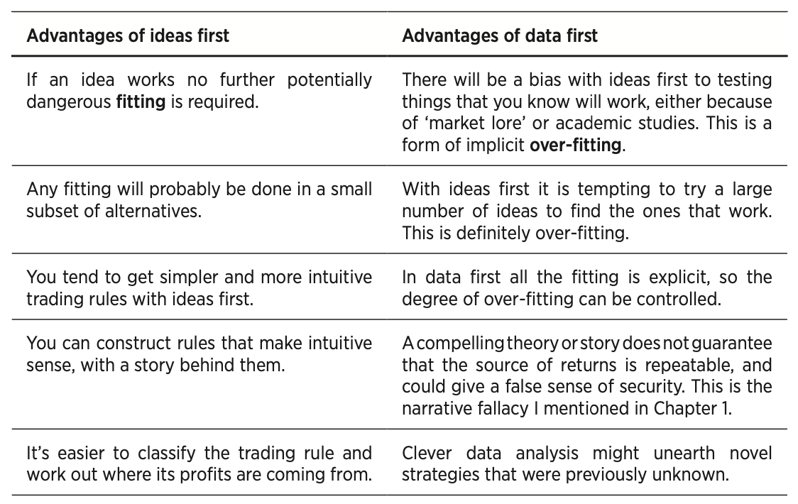 But some situations the data first process could be better; for example in high frequency trading where there is plenty of data, rules can be refitted regularly and novel ideas are more likely to be found as market structure evolves.