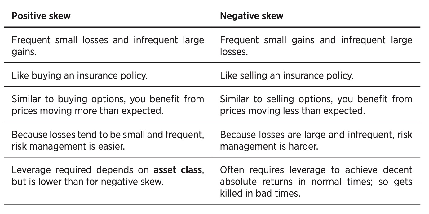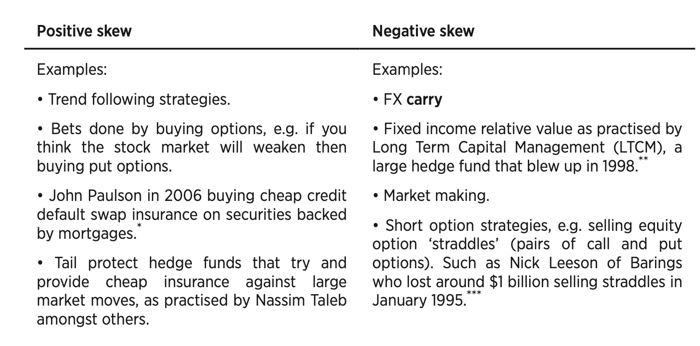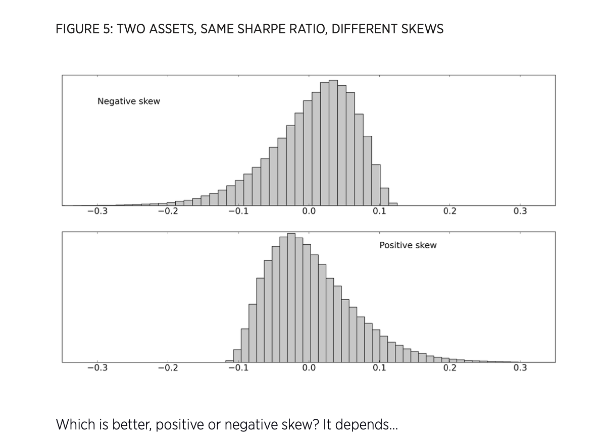 Equities normally have mildly negative skew. ‘Safe haven’ assets like gold and Swiss francs tend to have positive skew.