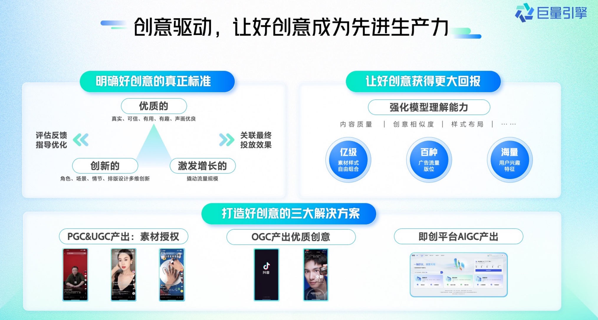 对于客户,多样性问题体现在客户投放不把重心放在素材制作,而是放在了计划复制等各种投放的 “骚操作” 上,导致素材重复度高,用户审美疲劳,长期对广告交付的用户体验指标、广告相关转化率都有负向影响;针对这一点,需要平台侧应做相关的引导,引导客户去把精力放到素材制作上,巨量引擎的 创意型自动化投放平台 做的就是这件事情,巨量平台上对广告主的引导也是希望广告主通过创意驱动生意(下图来自 2024 巨量引擎营销通案)