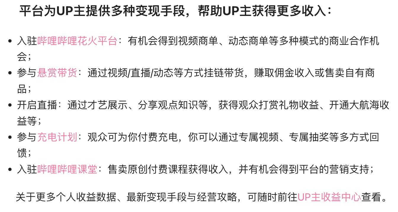 创作者的变现的途径有很多,包括来自 B 端(如商单推广、直播带货)、来自平台(如平台的补贴)、来自 C 端(如直播打赏、充电等)等,参考 B 站的创作者变现介绍