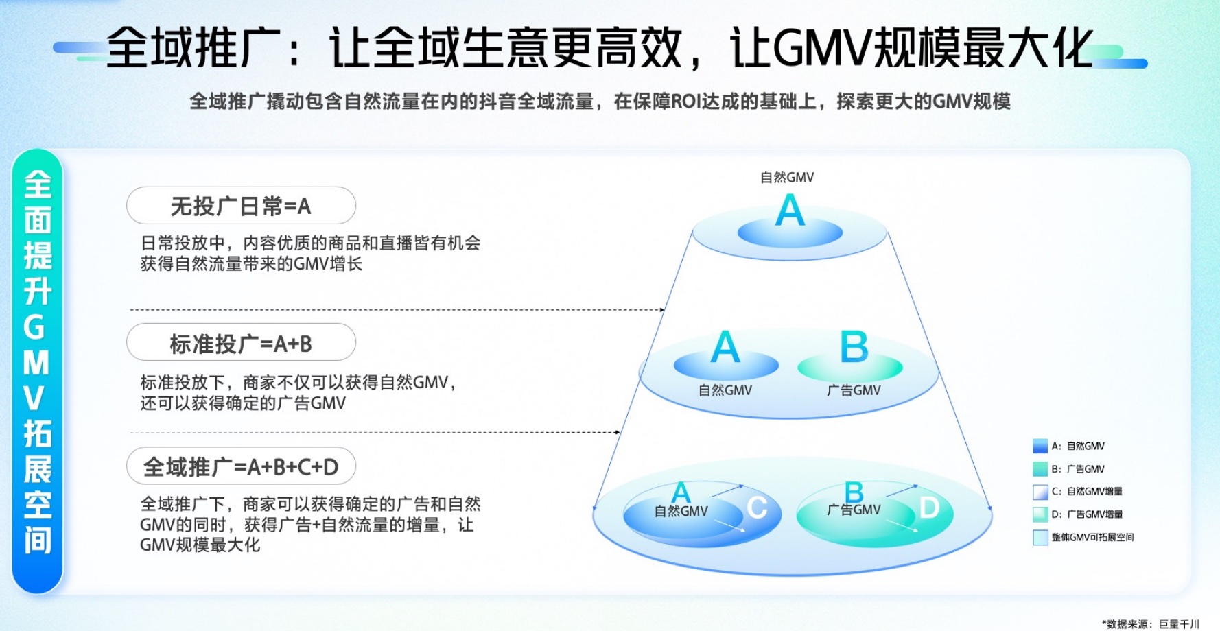 (2)全域推广,做引流的商家的经营阵地可能不在对应的媒体平台上(如从抖音引流到淘宝的商家,主要经营阵地在淘宝),这种商家一般不会在抖音上做日常内容的运营(即自然流量少),投引流也是考核 roi 是否达标;但是闭环电商的商家是有动力在平台上做内容来获取自然流量的,对于这部分商家,业界推出了 “全域推广” 类产品来让商家更好获取自然 + 广告流量
