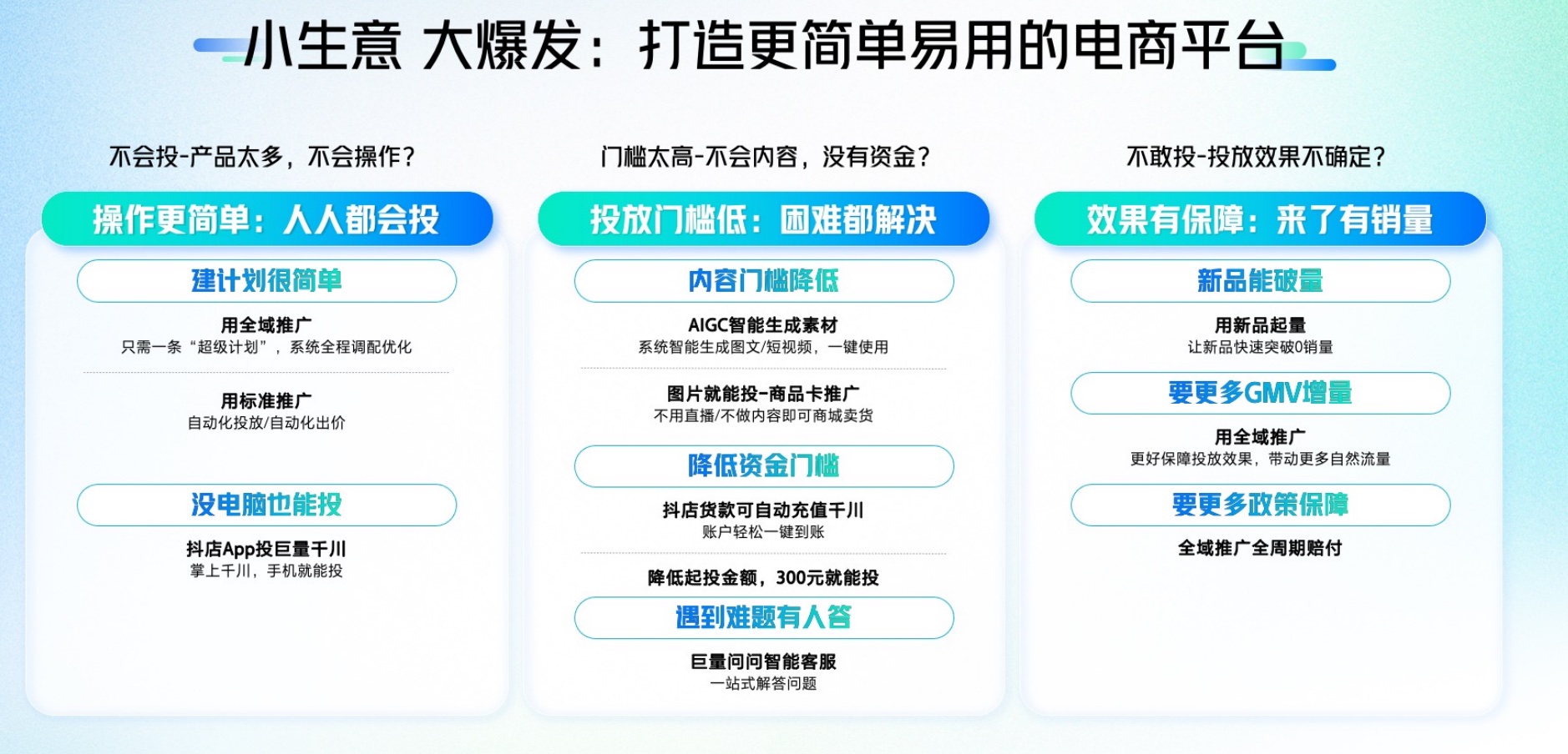 因此平台针对这部分 SMB 广告主的投放产品要做到易用性足够好,包括提供更低便捷的投放入口和投放引导,简化创编流程,同时提供一些自动的素材生成和编辑能力,提升这部分广告主使用平台的便捷性