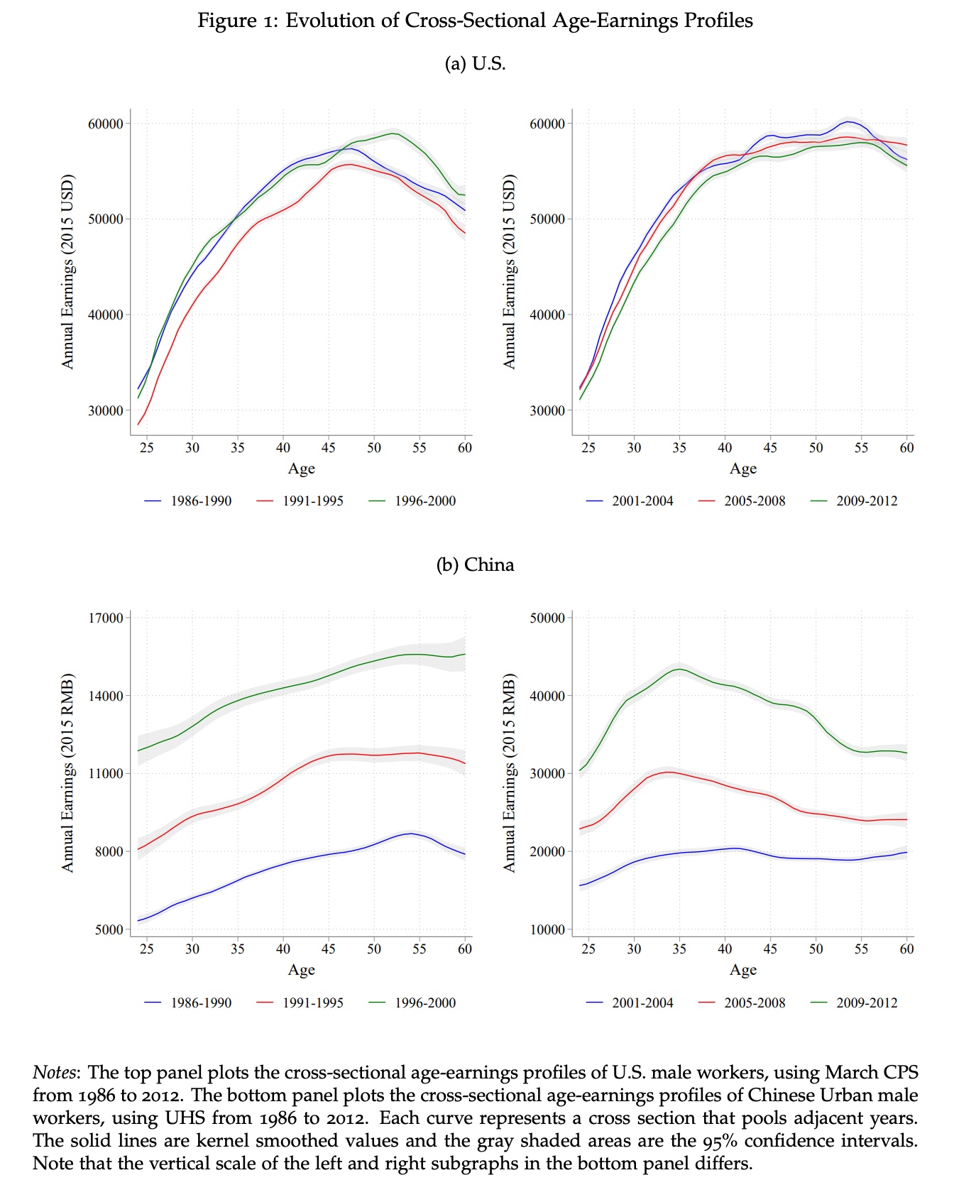 在 “GOLDEN AGES”:A TALE OF THE LABOR MARKETS IN CHINA AND THE UNITED STATES,将工资随着年龄变化的原因分解成三个部分:工作经验、时间效应(不同年份的平均工资水平变化)和队列效应(每个世代的劳动者能力差异);研究显示美国不同年代的时间效应和队列效应很小,但在中国这两者影响巨大。如下图所示