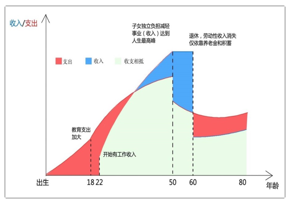 人一生的财富大体分为两部分,其一是呈现倒 u 型曲线的人力资本,其二是曲线起伏但最终会朝着东北方向推进的金融资产。所以度过中年在财务上的表达就是我们的人力资本曲线是向下的,但是在这个过程中,我们用保险兜住了下限,再用金融资产所释放出来的现金流去进一步的弥补劳动收入的减少