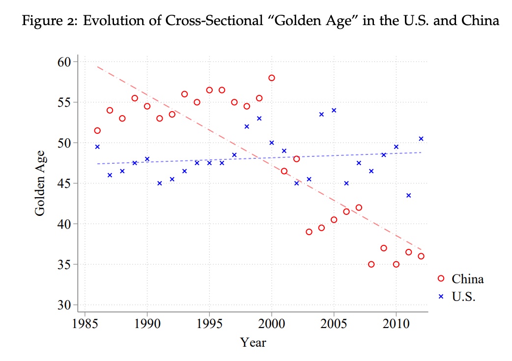 在不同国家的就业市场上,年龄收入曲线都呈现倒 U 型分布,倒 U 型顶部的年龄称为 “golden age (黄金年龄)” 美国和中国的 2000 年以前,“黄金年龄” 稳定在 50-55 岁左右。2000 年以后美国继续不变,但中国的黄金年龄不断下降,到 2005 年以后降至 35 岁,如下图所示,配图来自 “GOLDEN AGES”:A TALE OF THE LABOR MARKETS IN CHINA AND THE UNITED STATES