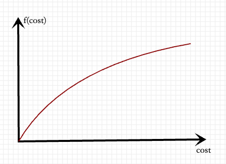 这个方法的关键点是建模 cost2convert 的函数 \(f(cost) = convert\),常见的一个先验假设是随着 cost 增加,转化数的增加速度逐渐减小,或者说边际成本是逐步增加的,如下图所示(横轴是消耗,纵轴是转化数);这个假设也比较直观,因为对于一个计划而言,便宜的转化拿完了,需要出更高的价才能拿得到转化,转化成本是随之增加的