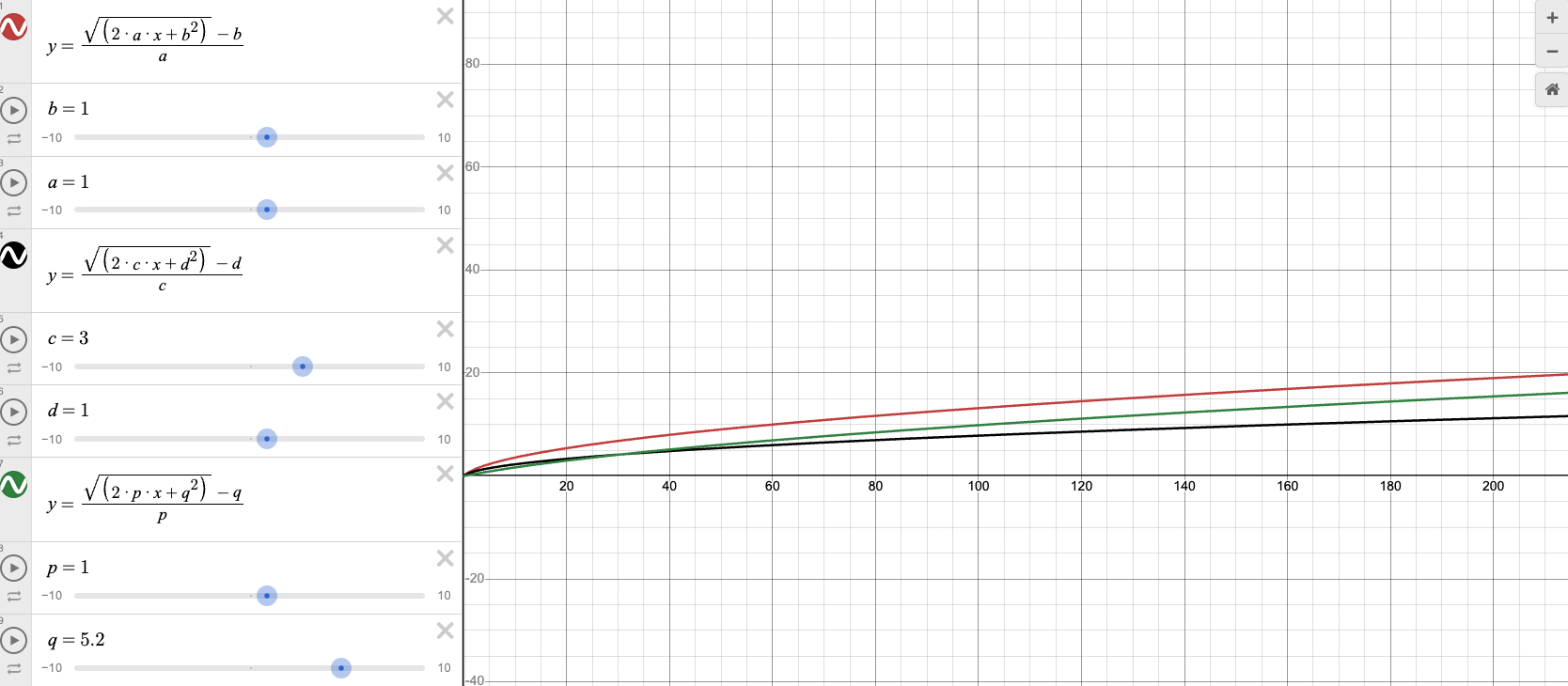 如果直接看这个函数,大概长下面这个样子的;从红线到黑线,代表 \(\omega\) 从 1 变成了 3,\(b\) 不变,从红线到绿线,代表 \(b\) 从 1 变成了 5.2, \(\omega\) 不变,两者在花相同的 cost 前提下,转化数都更少了,即转化成本上涨了