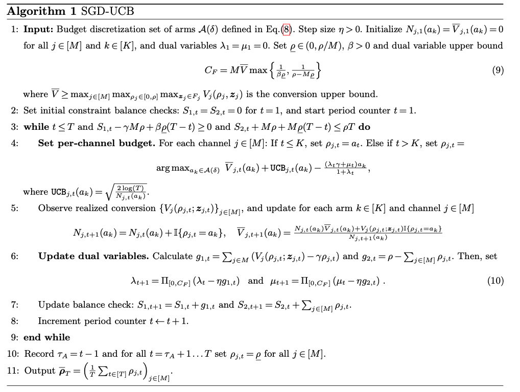 这个算法结合了 SGD 和 UCB,整体目标是在 budget 约束下最大化总转换数;这里基本就是套用了 Multi-Arm Bandits 的范式,将连续预算空间离散化为有限臂(候选预算值),然后基于 MAB 的探索与利用机制:迭代选择臂、观测反馈、更新统计信息,优化预算分配策略;不同的点是引入了对偶变量和 sgd(上图的公式 10),用来处理预算约束,传统的 MAB 没有涉及到这一点